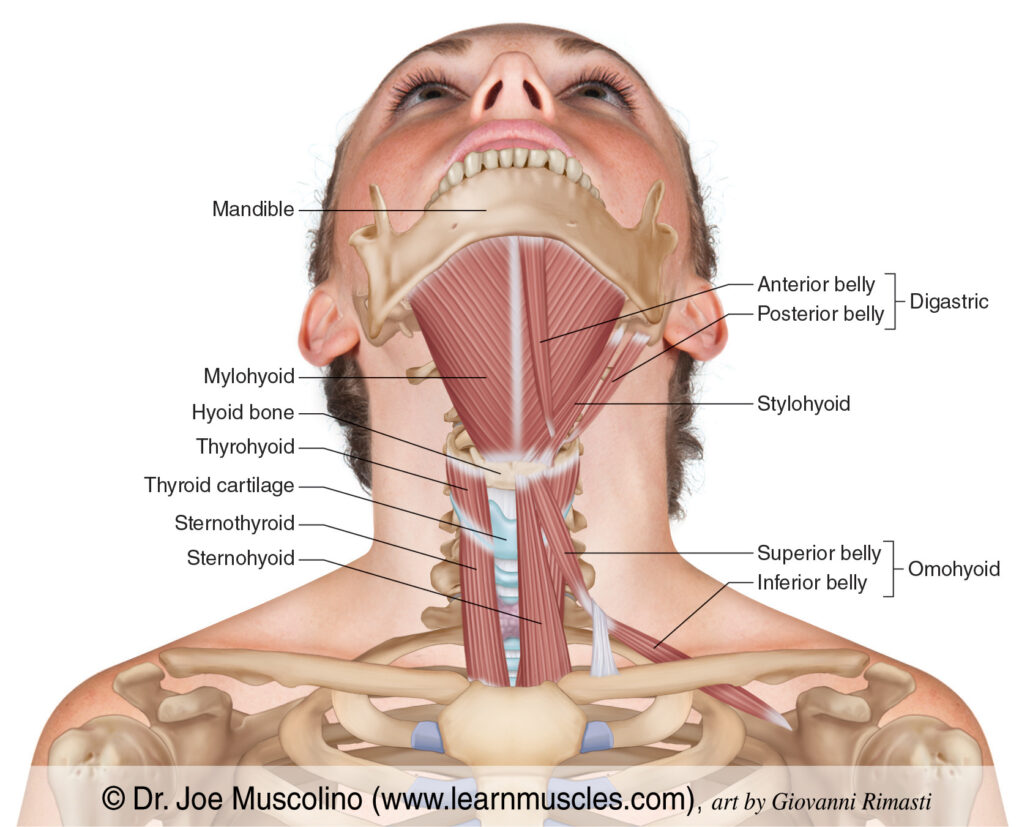 These are a set of smaller, more delicate muscles located in the neck that support the jaw, throat, and tongue. While they’re not as well known, they are also involved in mastication and play an important role in tongue position and how the jaw moves and feels.