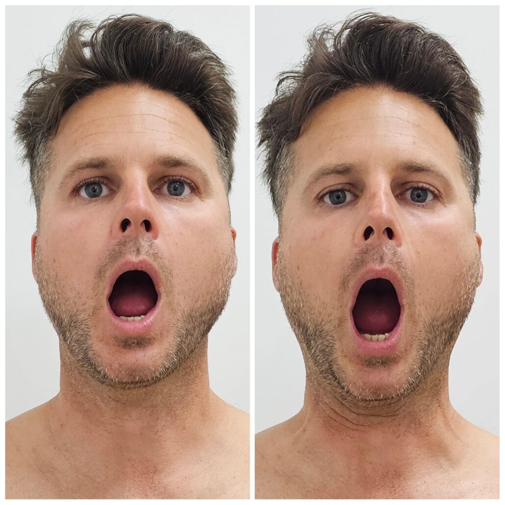 - After: the jaw is tracking more neutral relative to his anatomy and his range improved significantly