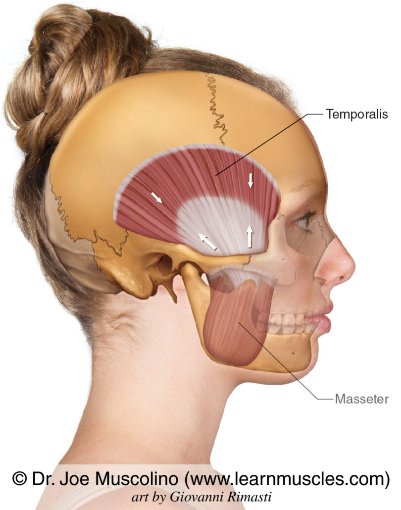 - Temporalis – sits on the side of your head and is often involved in tension headaches (it’s the one people instinctively rub).